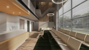URAKATAstudioでは、平田様よりご依頼を受け、そのデザイン案をビジュアル化するために受付待合室の内観パースを制作しました。